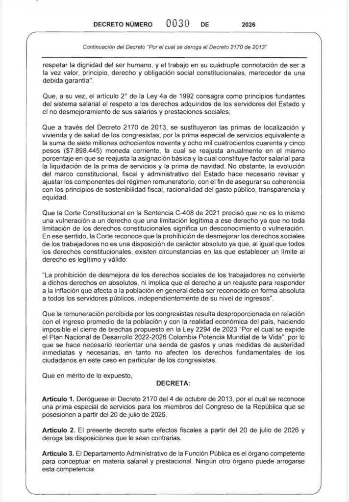 A través del decreto 030 del 19 de enero del 2026, el departamento administrativo de la función pública derogó la prima especial de servicios, de cerca de 17 millones de pesos mensuales, para los congresistas.